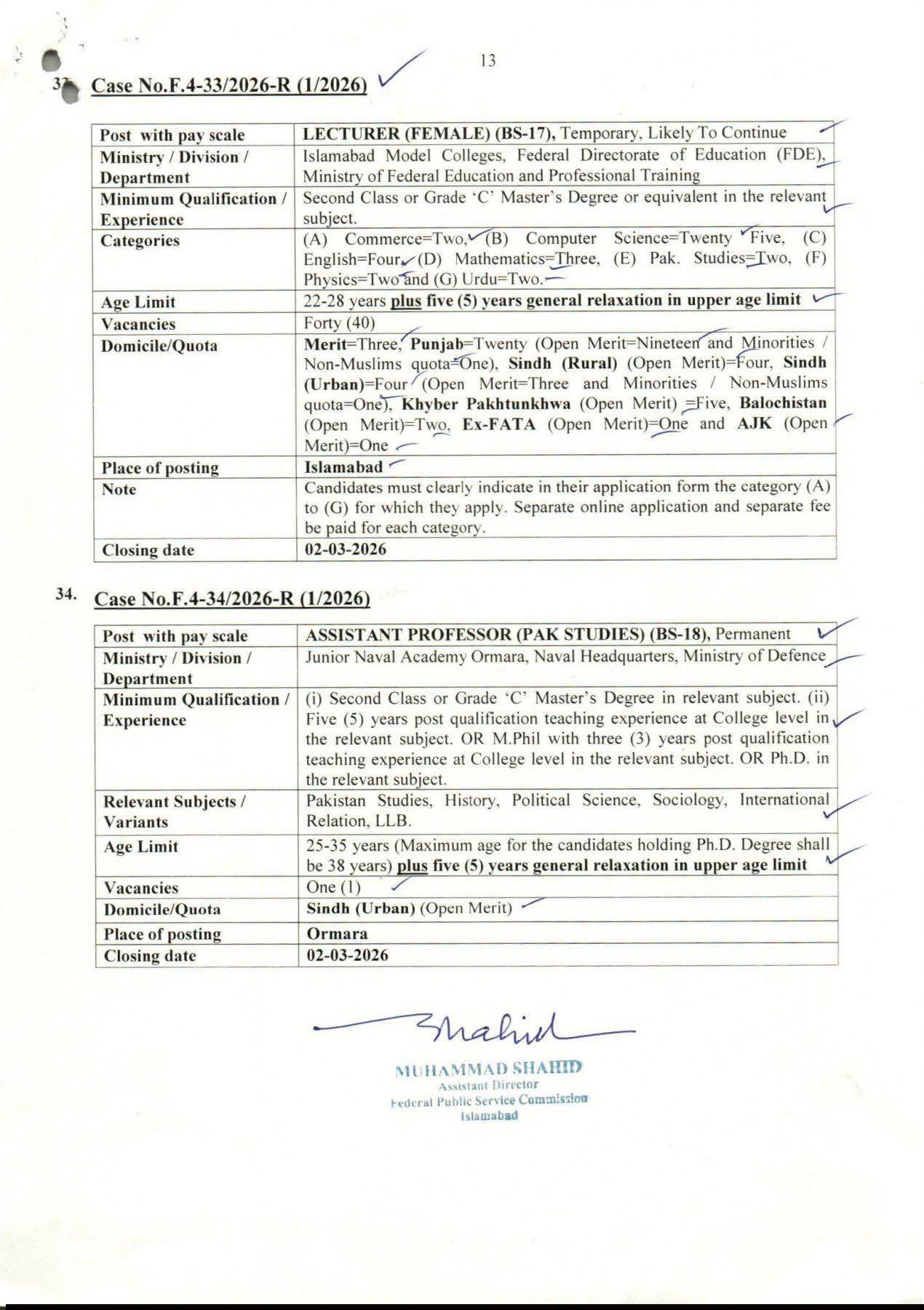 Assistant Professor (Pak Studies – BS-18)