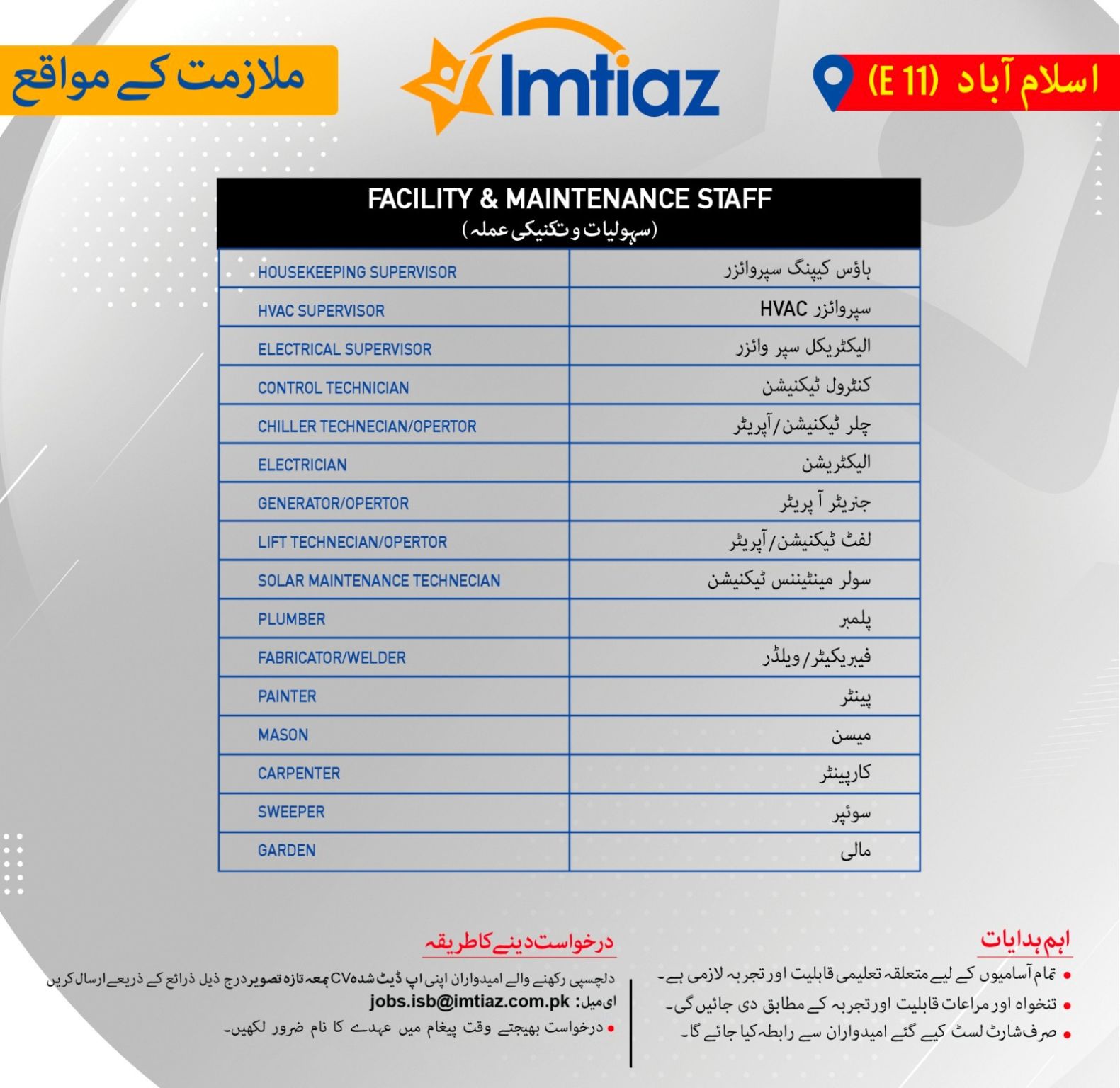 Email: jobs.isb@imtiaz.com.pk