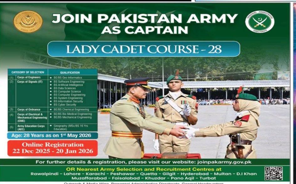 پاکستان آرمی کی جانب سے خواتین امیدواروں کے لیے لیڈی کیڈٹ کورس 28 کے تحت کیپٹن کے عہدے پر بھرتی کا باضابطہ اعلان کر دیا گیا ہے۔ اس سلسلے میں جاری سرکاری اشتہار کے مطابق ملک بھر سے اہل خواتین امیدوار آن لائن رجسٹریشن کے ذریعے درخواست دے سکتی ہیں۔