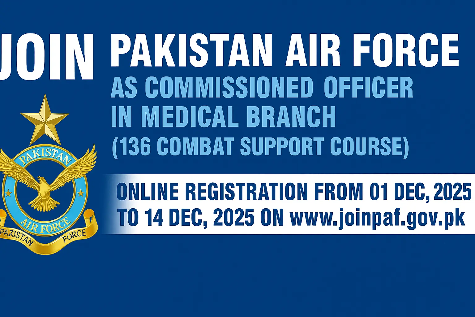 The Pakistan Air Force has opened online registration from 1 December to 14 December 2025 for medical professionals to join as commissioned officers in the Medical Specialist and GDMO branches under the 136 Combat Support Course. Both male and female citizens of Pakistan can apply subject to eligibility and required qualifications.