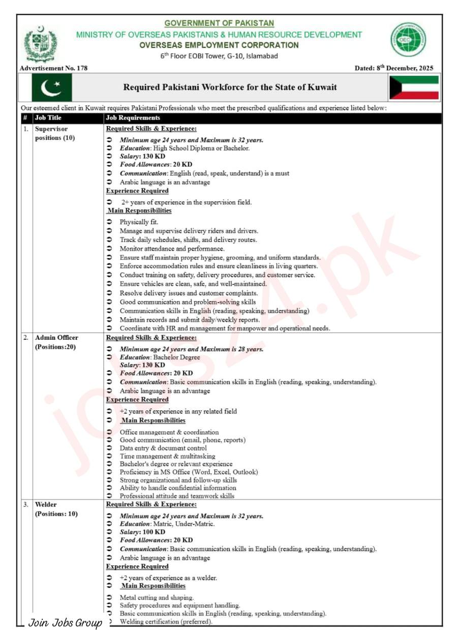 For many Pakistanis, Kuwait remains one of the most attractive destinations for secure, well-paying overseas jobs. The Overseas Employment Corporation (OEC), Government of Pakistan, has just released Advertisement No. 176 announcing multiple vacancies for a reputable company in Kuwait. If you’ve been looking for a safe, government-channel opportunity with stable income and legally protected benefits, this recruitment drive is worth your attention.