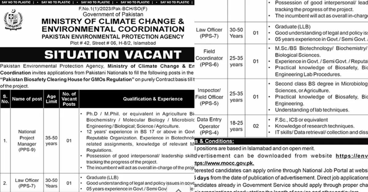 The Ministry of Climate Change & Environmental Coordination (MOCC) has announced new job opportunities under the Pakistan Environmental Protection Agency (Pak-EPA) for the PSDP Project titled “Pakistan Biosafety Clearing House for GMOs Regulation.”