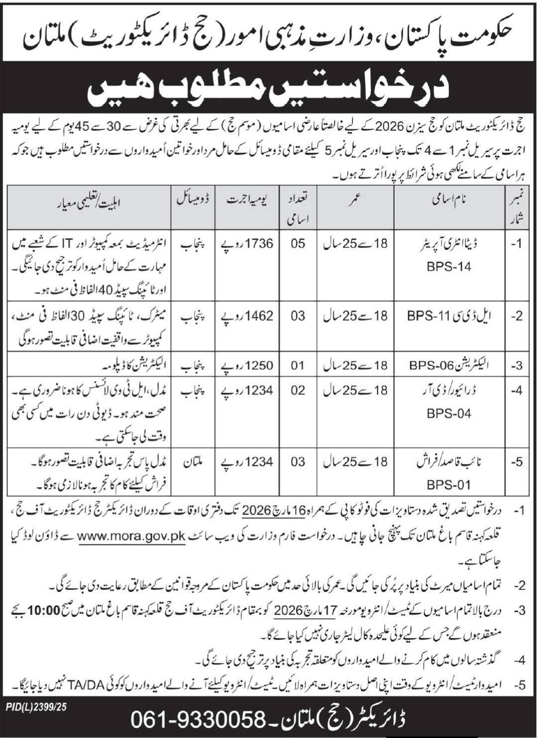 The Government of Pakistan has announced new job opportunities under the Ministry of Religious Affairs & Interfaith Harmony (Hajj Directorate), Sector G-14, Islamabad. Applications are invited from suitable male and female candidates for multiple positions on a temporary basis for Hajj Season 2026.