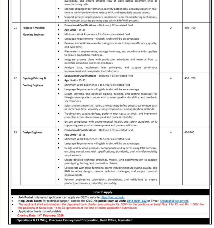 | 21 | Process & Material Planning Engineer | 2 | 450 – 700 |