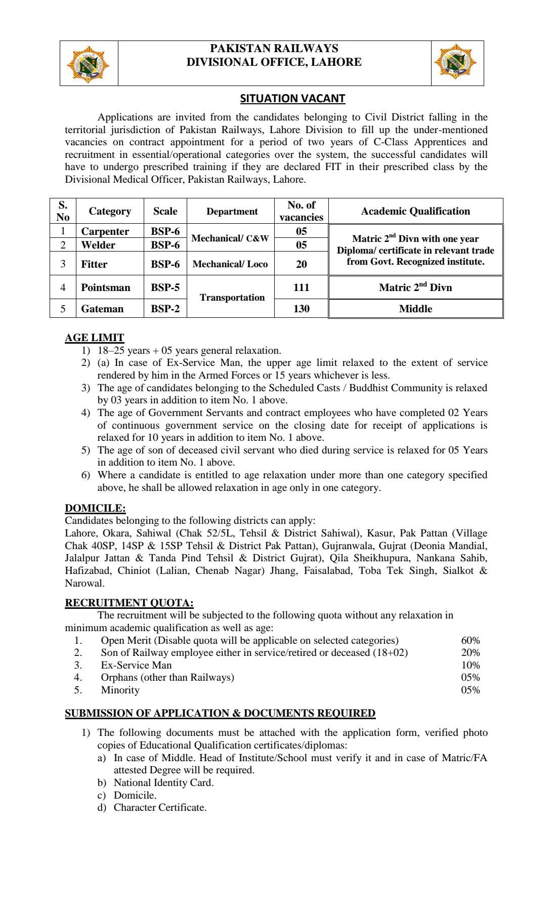 | Pointsman (BPS-05) | Matric with at least 2nd Division | As per rules (no specific experience mentioned) |