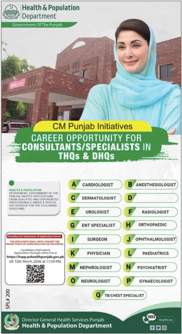 The Health & Population Department, Government of the Punjab, has announced new career opportunities for qualified and experienced medical professionals. Applications are invited under a special pay package for Consultants and Specialists in THQs and DHQs across Punjab.