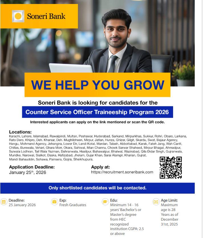 Soneri Bank has announced its Traineeship Program 2026 under the theme “We Help You Grow”. This recruitment drive includes two excellent entry-level banking opportunities for young candidates across Pakistan: