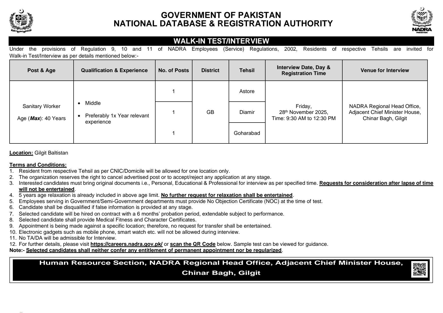 3) NADRA Walk-In Interview – Sanitary Worker (Gilgit Baltistan)